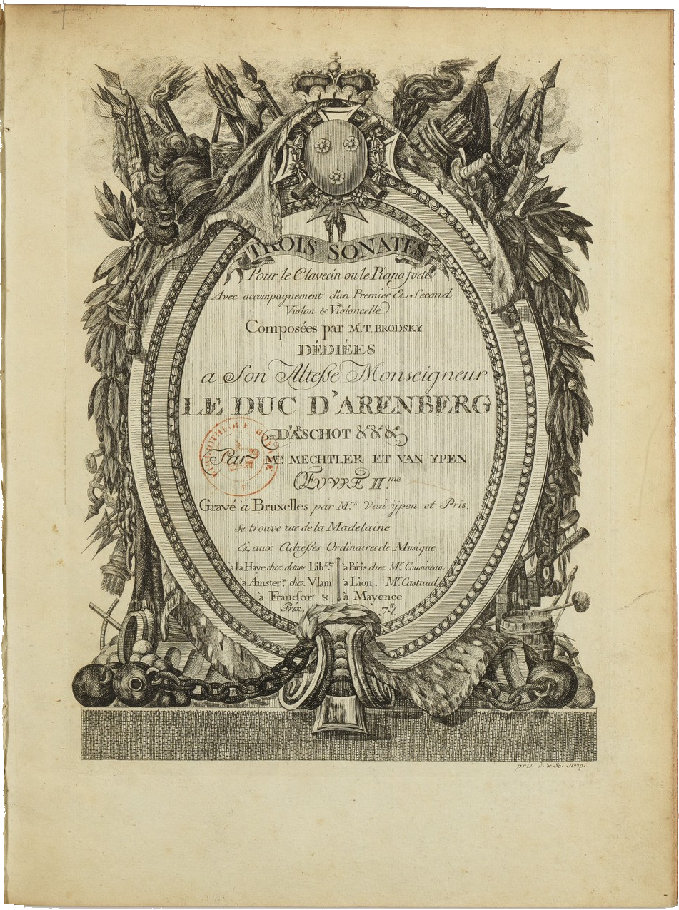 Thomas Brodsky. Trois Sonates pour le clavecin ou le piano-forte avec accompagnement d’un premier et second violon et violoncelle, op. 2. Bruxelles : Van Ypen et Pris, 1776, page de titre. BnF, département de la Musique, VM7-5364.