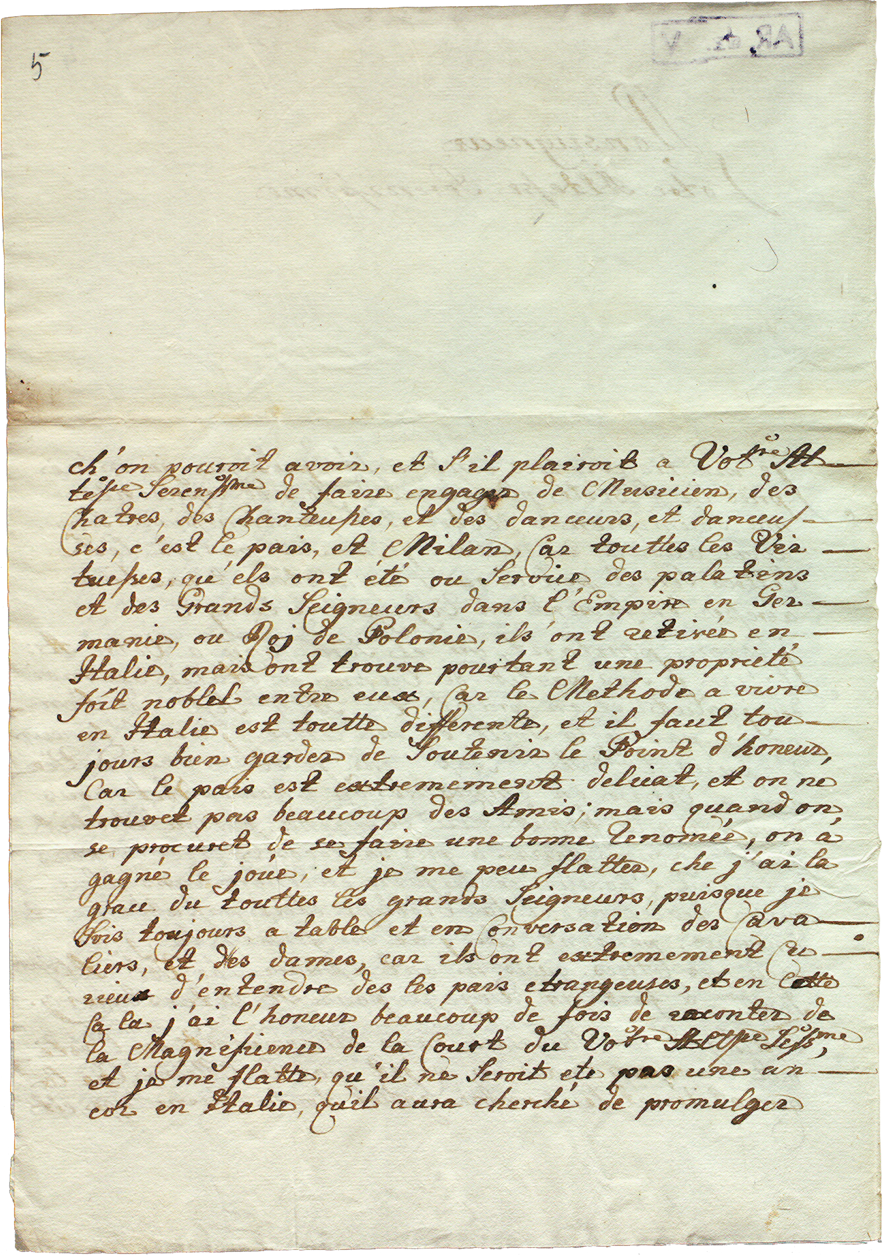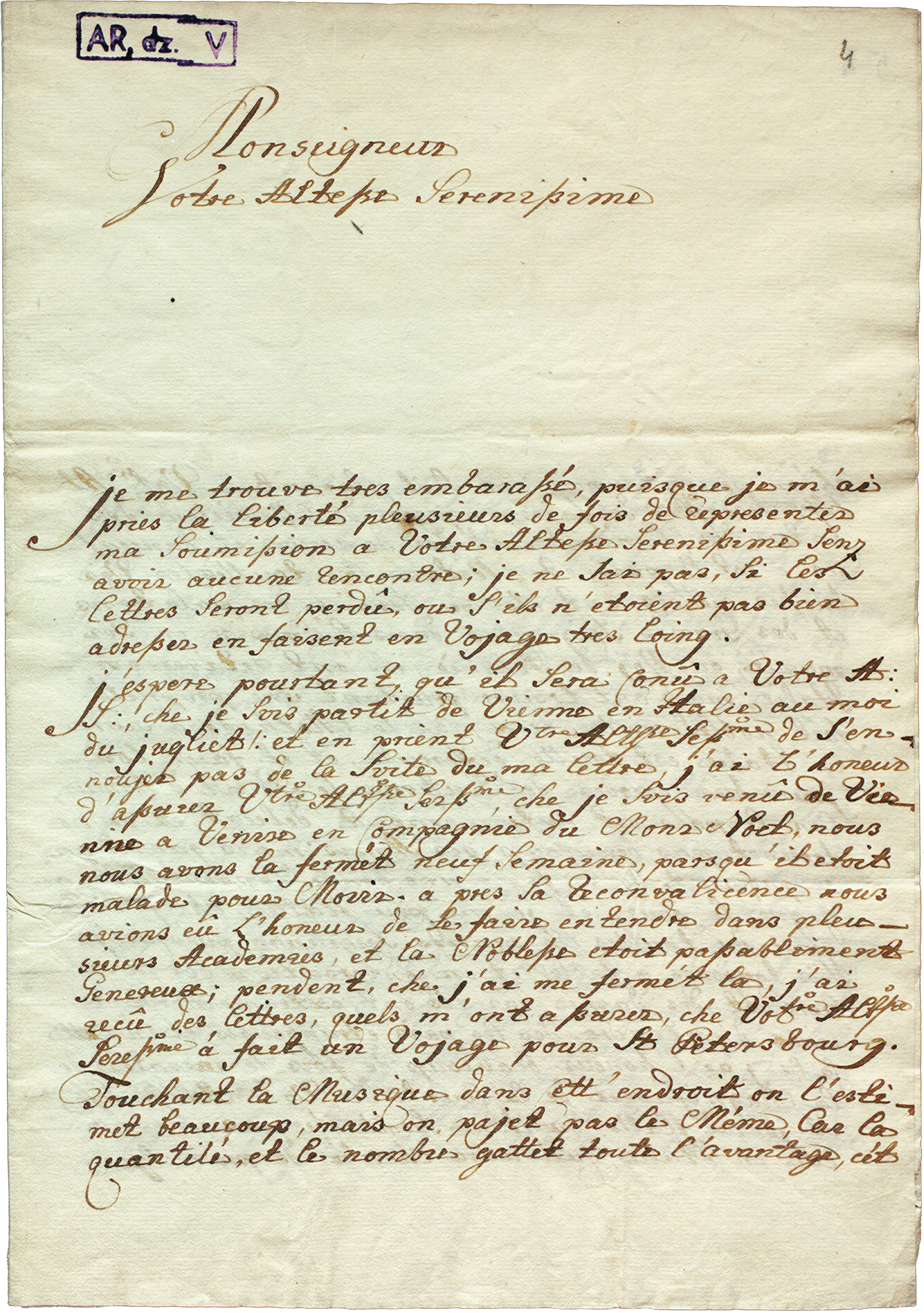 Lettre de Joseph Kohaut au prince Hieronim Florian Radziwiłł. Gênes, 5 janvier 1760. Warszawa, Archiwum glówne akt dáwnych, cote 1/354/0/5/6987, fol. 4-10. (© Archiwum glówne akt dáwnych, Warszawa)