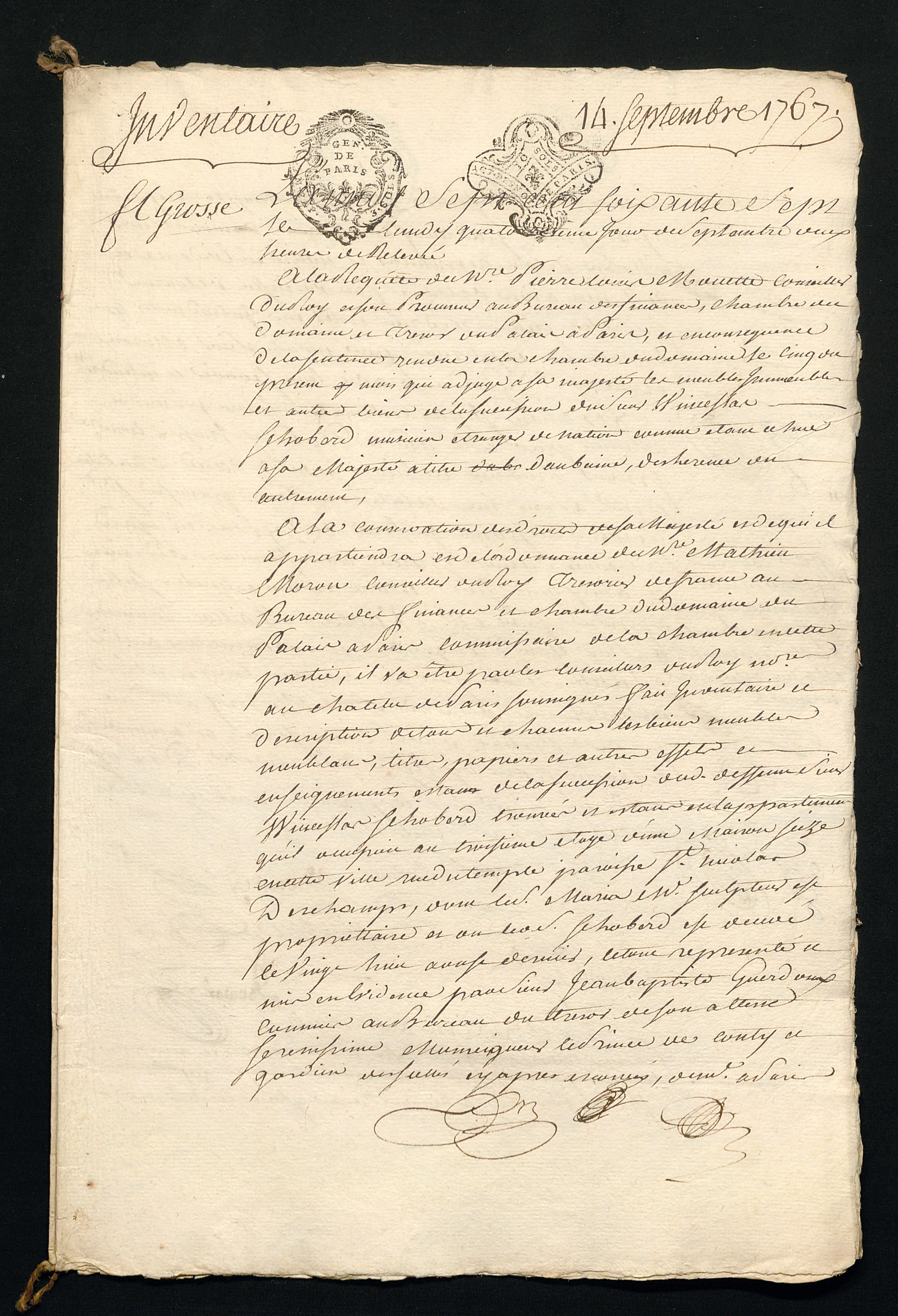 Inventaire après décès de « Winceslas Schobert, musicien étranger de nation », 14 septembre 1767. Archives nationales, Paris, MC/ET∕LXXIII/895. (© Archives nationales, Paris)